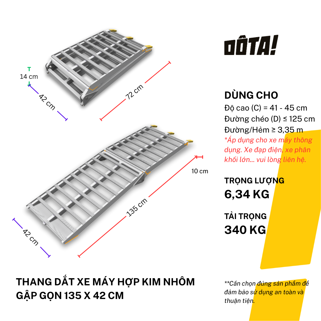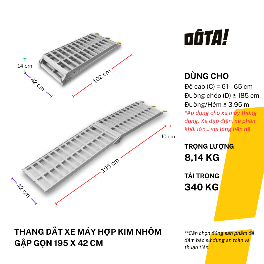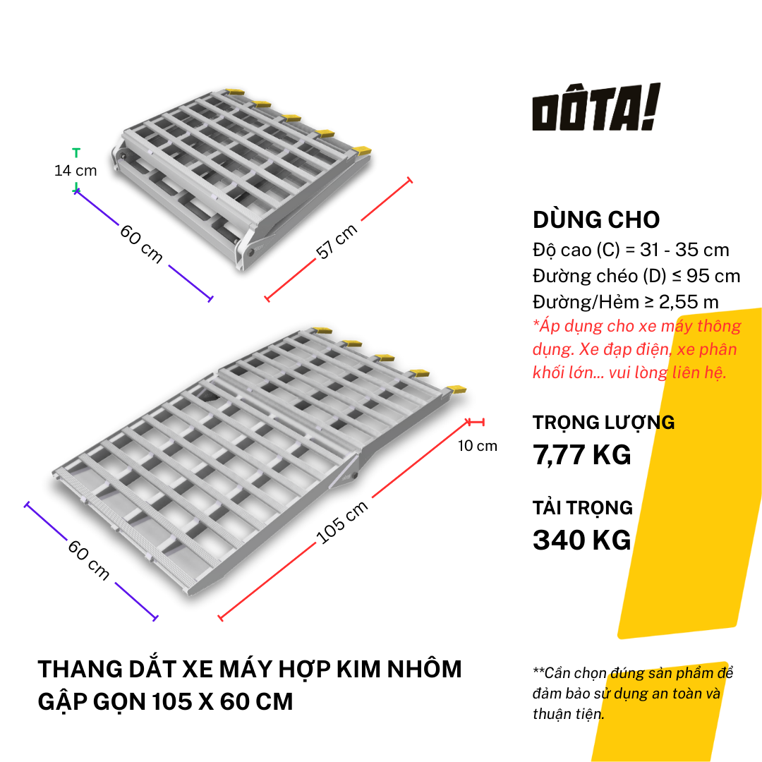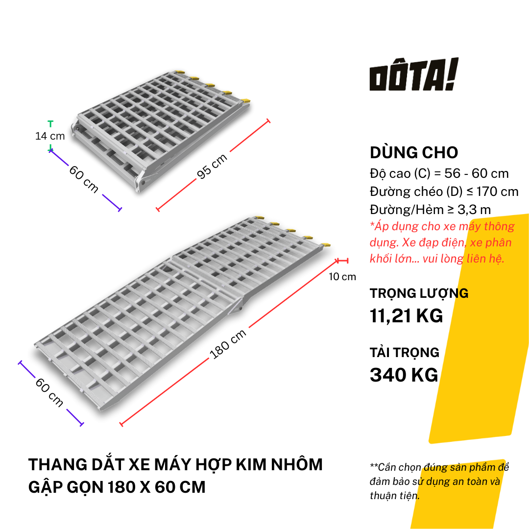1. Dòng sản phẩm Thang Dắt Xe Máy Hợp Kim Nhôm còn có cả loại 1 thân liền và loại thiết kế riêng để đặt xéo dành cho nhà trong ngõ nhỏ (cần liên hệ tư vấn để tránh ngõ không đủ lên xe), gồm đủ cỡ chiều dài 30, 45, 60, 75, 90, 105, 120, 135, 150, 165, 180, 195, 210, 225 cm, phù hợp với mọi độ cao từ 6.5 đến 75 cm. Xem danh sách đầy đủ của dòng sản phẩm này và chọn kích cỡ phù hợp với độ cao thềm nhà bạn tại: https://dotavietnam.vn/collections/tat-ca-san-pham
