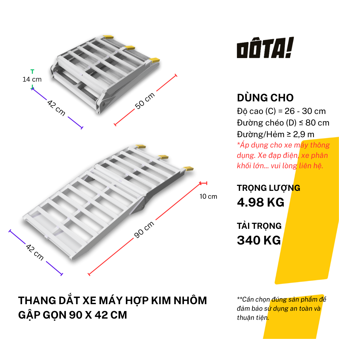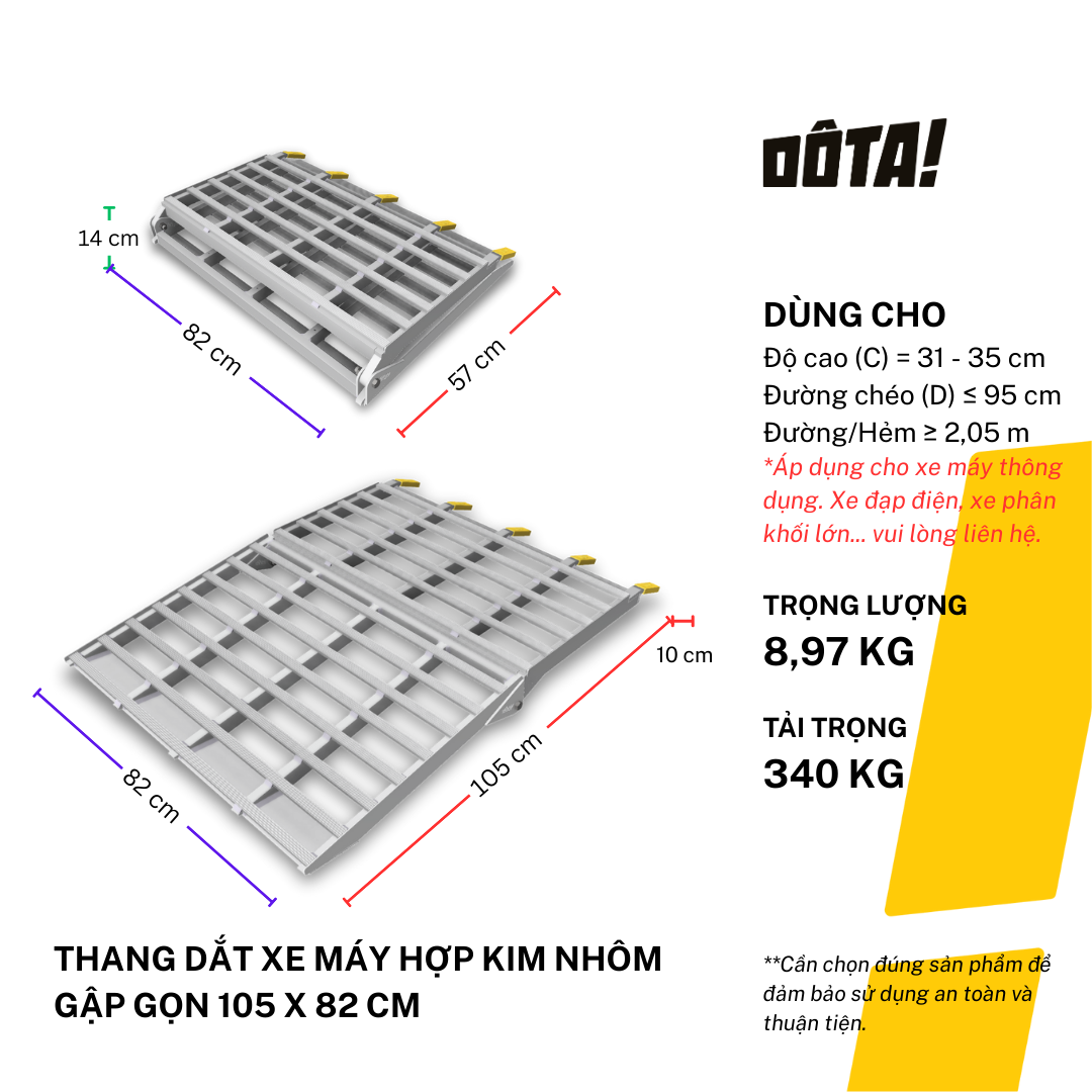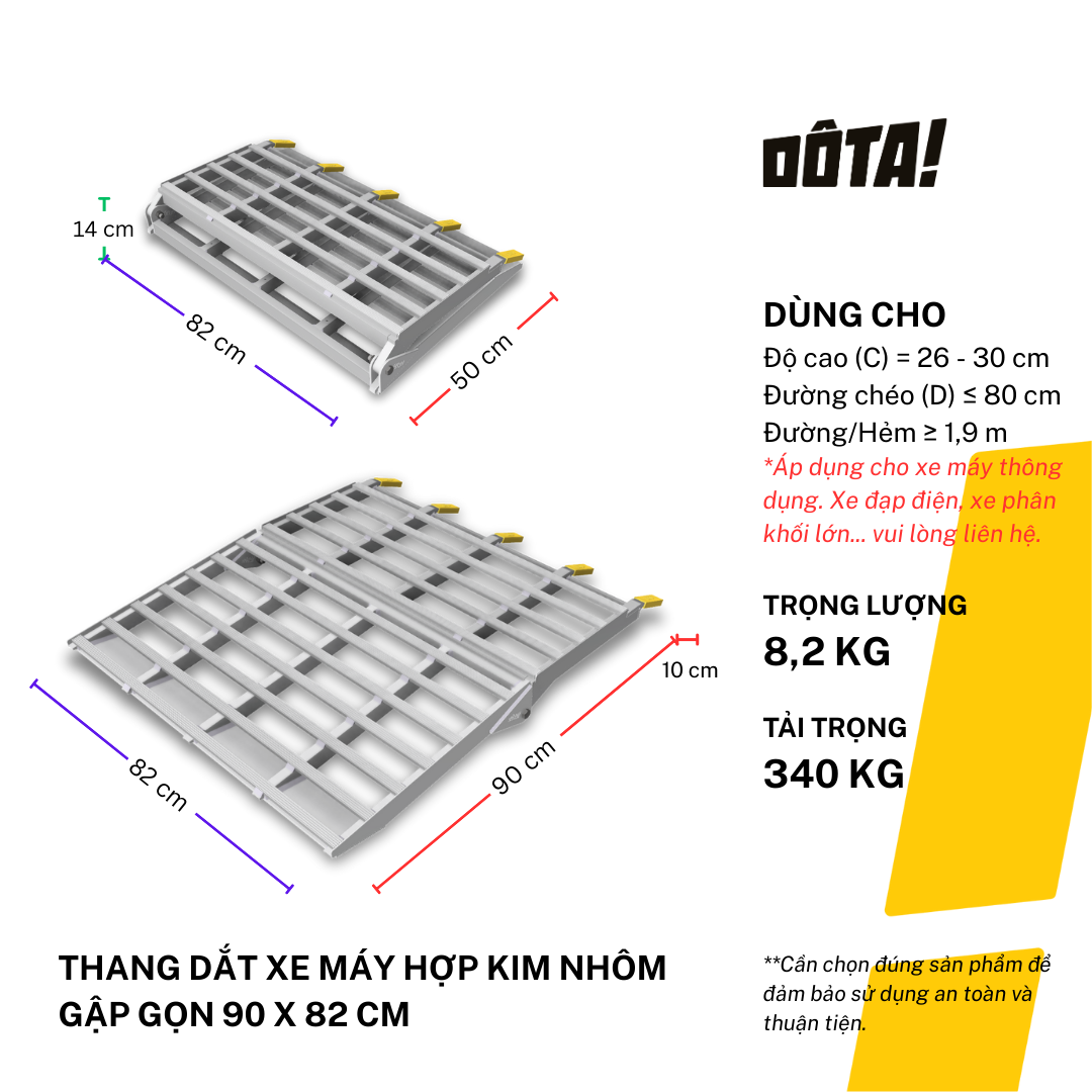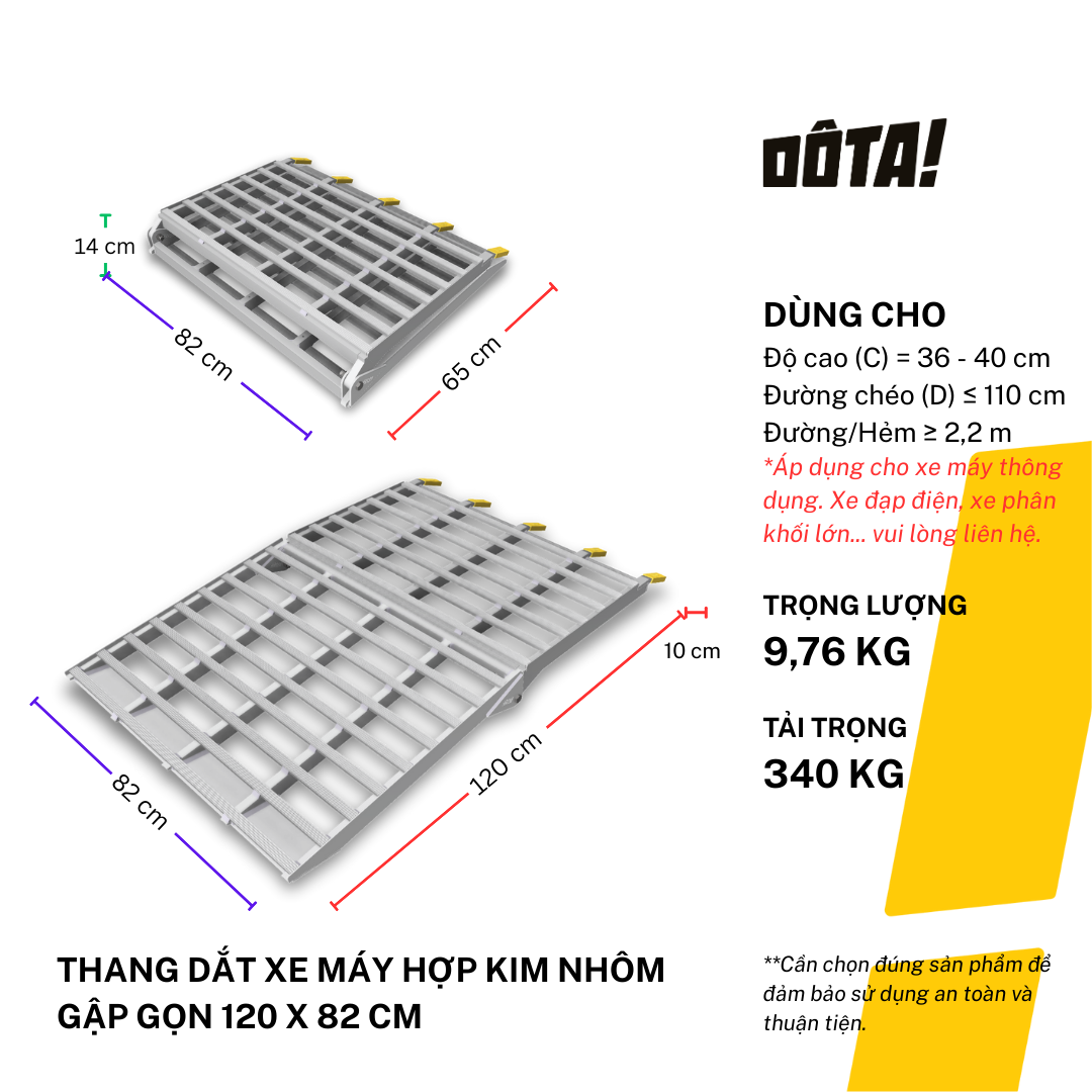 1. Dòng sản phẩm Thang Dắt Xe Máy Hợp Kim Nhôm còn có cả loại 1 thân liền và loại thiết kế riêng để đặt xéo dành cho nhà trong ngõ nhỏ (cần liên hệ tư vấn để tránh ngõ không đủ lên xe), gồm đủ cỡ chiều dài 30, 45, 60, 75, 90, 105, 120, 135, 150, 165, 180, 195, 210, 225 cm, phù hợp với mọi độ cao từ 6.5 đến 75 cm. Xem danh sách đầy đủ của dòng sản phẩm này và chọn kích cỡ phù hợp với độ cao thềm nhà bạn tại: https://dotavietnam.vn/collections/tat-ca-san-pham